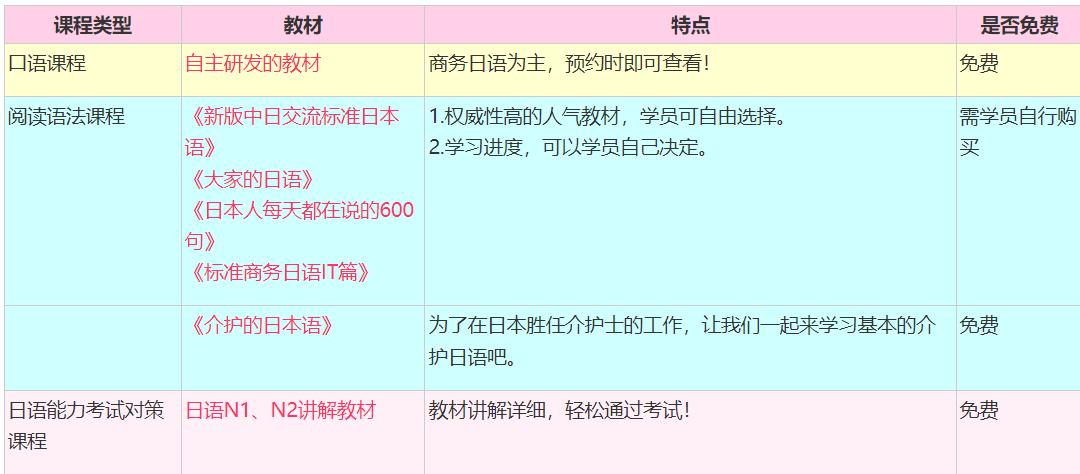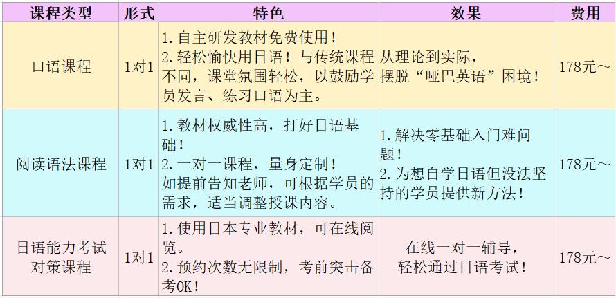 *说明: 1.费用指一课时的费用。天天日文的一课时=50分钟。